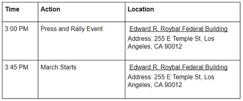 We will have a press conference and rally at the Edward R. Roybal Federal Building aka “Molecule Man”, a march down Temple Street, and end with a program at Pershing Square.