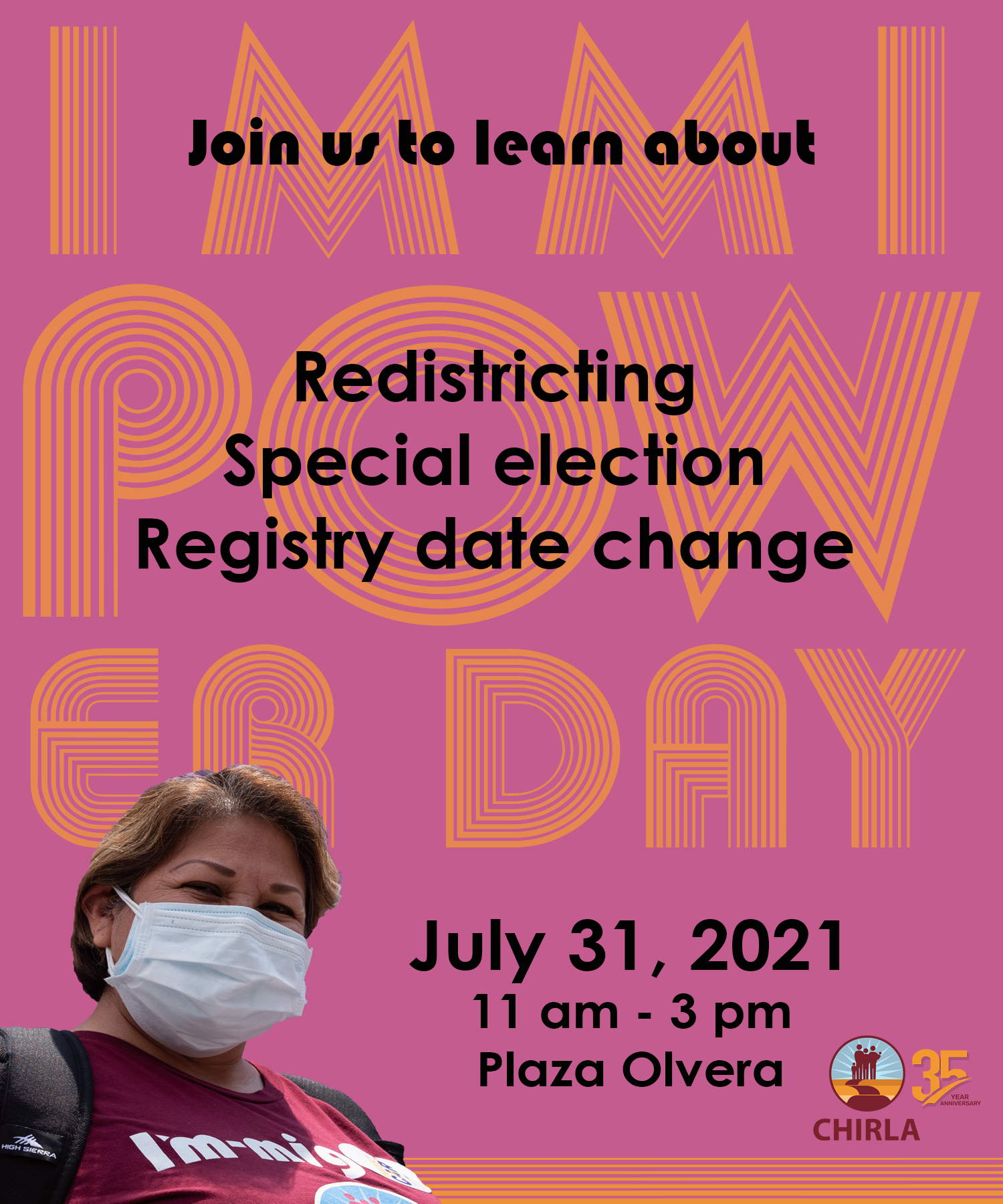 Plaza OlveraImmiPOWer Day! Date: Saturday, July 31, 2021 Time: 11:00 AM to 3:00 PM Location: Plaza Olvera CHIRLA is hosting ImmiPOWer Day to help immigrants in our community put themselves on the map! Participants will learn about redistricting, the special election of 2021, and the Yes to Immigrants Forward campaign. As they visit different booths, participants […]