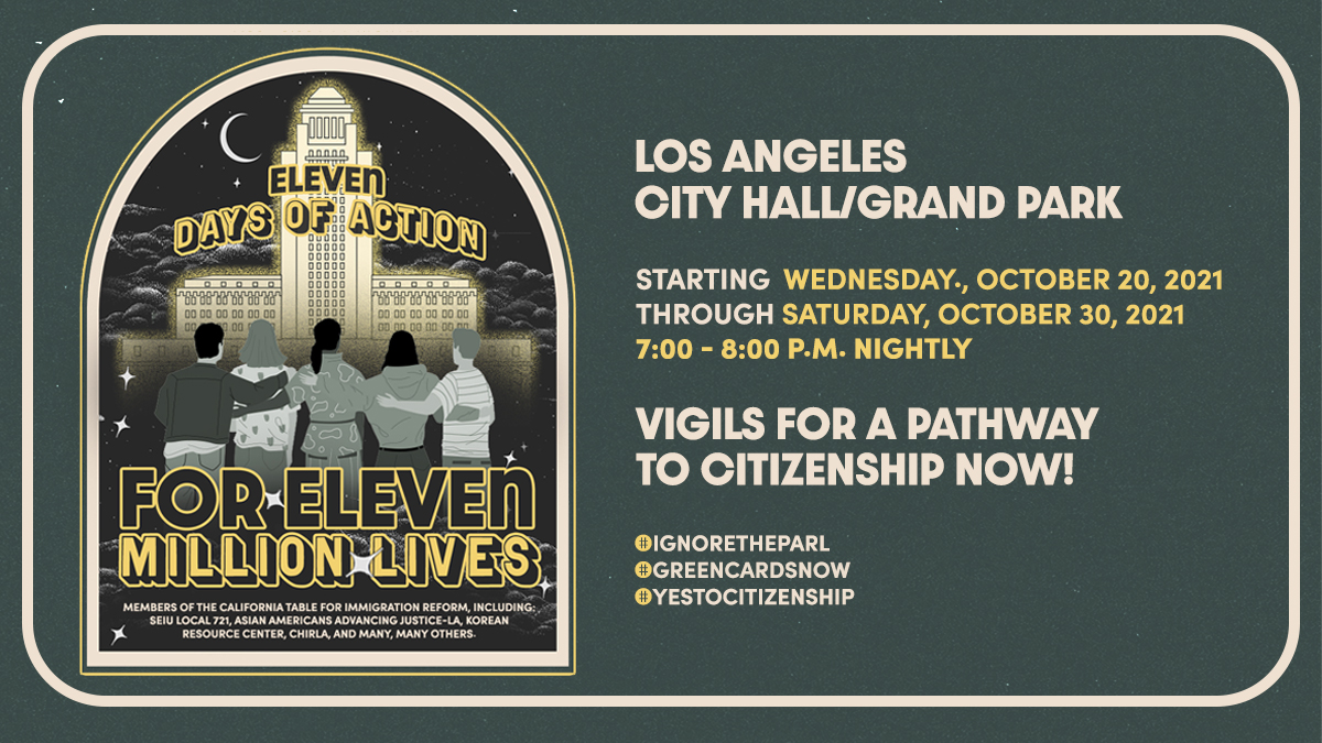 Grand Park 200 N Grand Ave, Los Angeles, CA, United States#11vigils4the11million. 11 Days of Action for the 11 Million Lives impacted by the lack of action in Congress. Nightly vigils starting Wed. 10/20 to Sat. 10/30, 7-8 p.m. at Grand Park/Los Angeles City Hall. Open to the public. JOIN US! We do not need yet another temporary fix that holds us hostage to the courts. […]